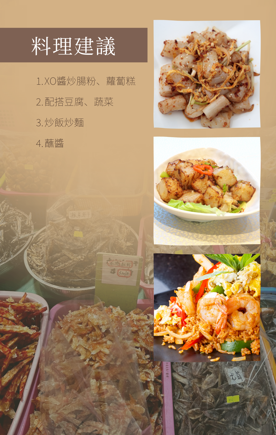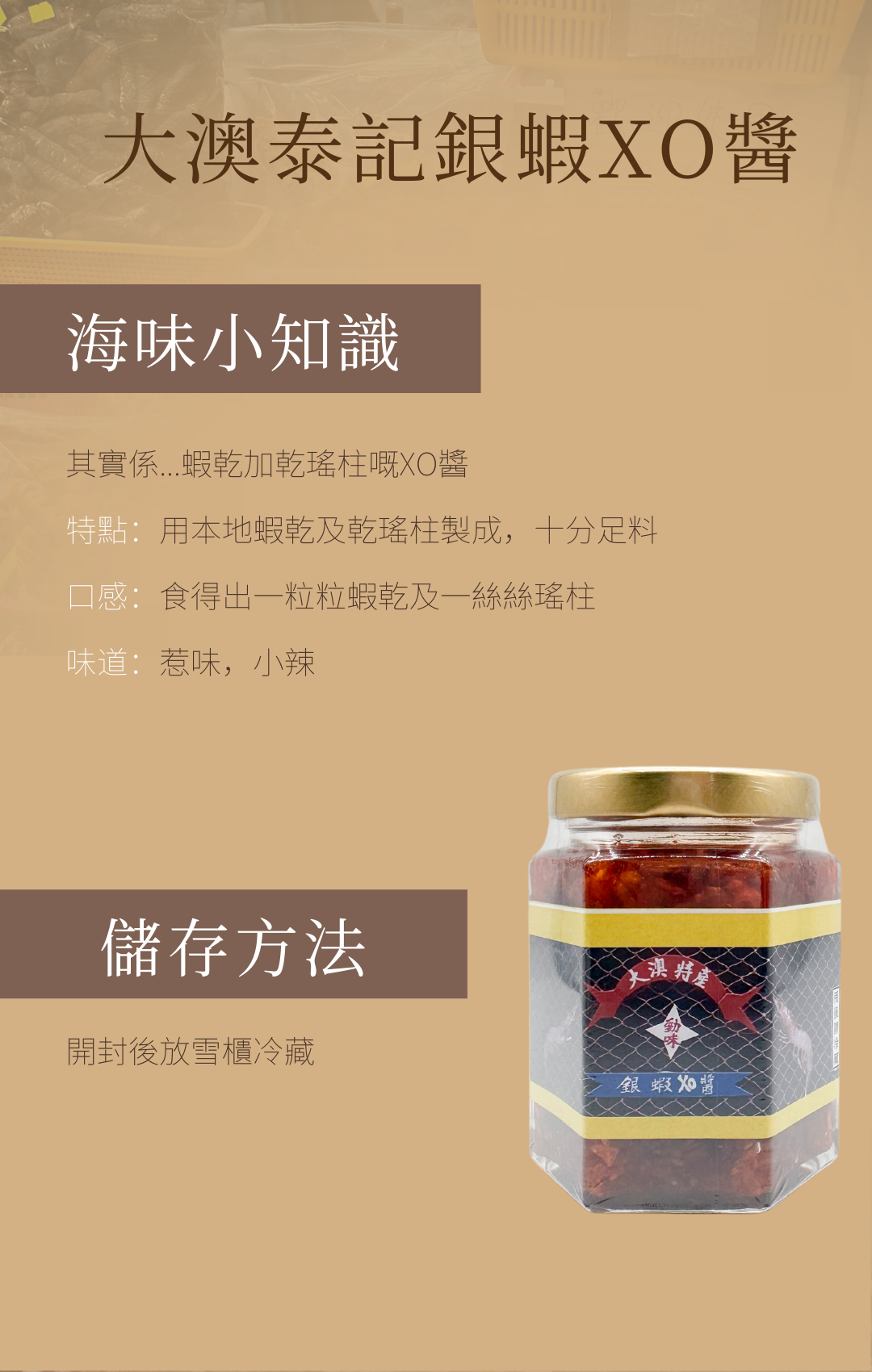 Ingredients: Dried silver shrimp, dried scallops, garlic, dried onion, chilli, vegetable oil, sugar, salt