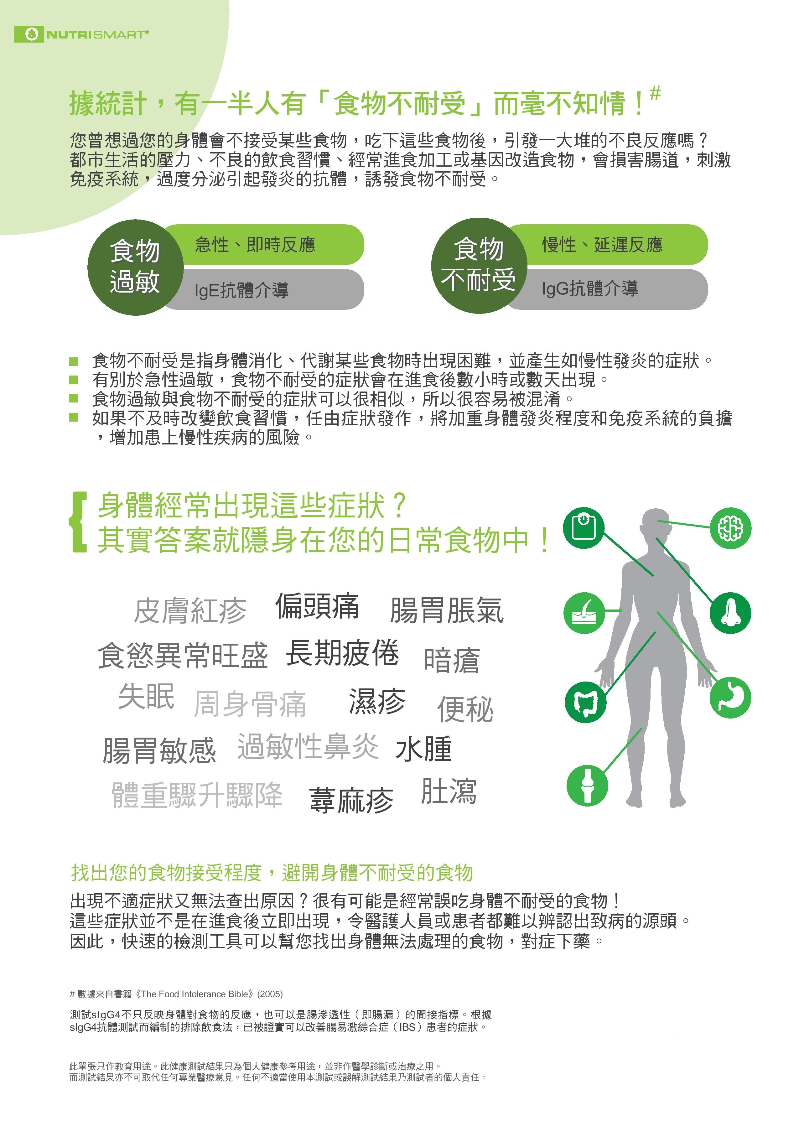 •據統計, 有一半人有 [食物不耐受] 而不知道, 這些人吃下某些食物後, 身體會引發一連串反應。[食物不耐受] 是指身體消化, 代謝某些食物時出現困難, 並產生有如慢性發炎的症狀, 例如皮膚紅腫痕癢、腹瀉、便秘、偏頭痛、暗瘡、鼻敏感等。
