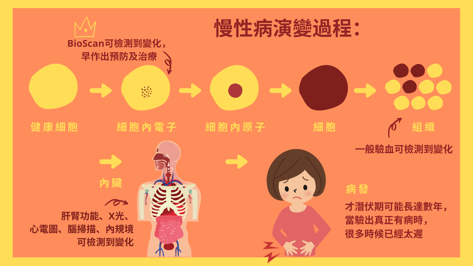 BioScan 是現今最先進及全面的身體檢查系統,透過監測細胞內分子的變化,並將數據與正常健康人體的標準作比較及進行量化分析,檢測出有否正在發展的機能失調或疾病,診斷準確率高達90%。無論是心腦血管、消化、循環、免疫、內分泌、神經系統,甚至骨骼的健康狀況都能一一反映。